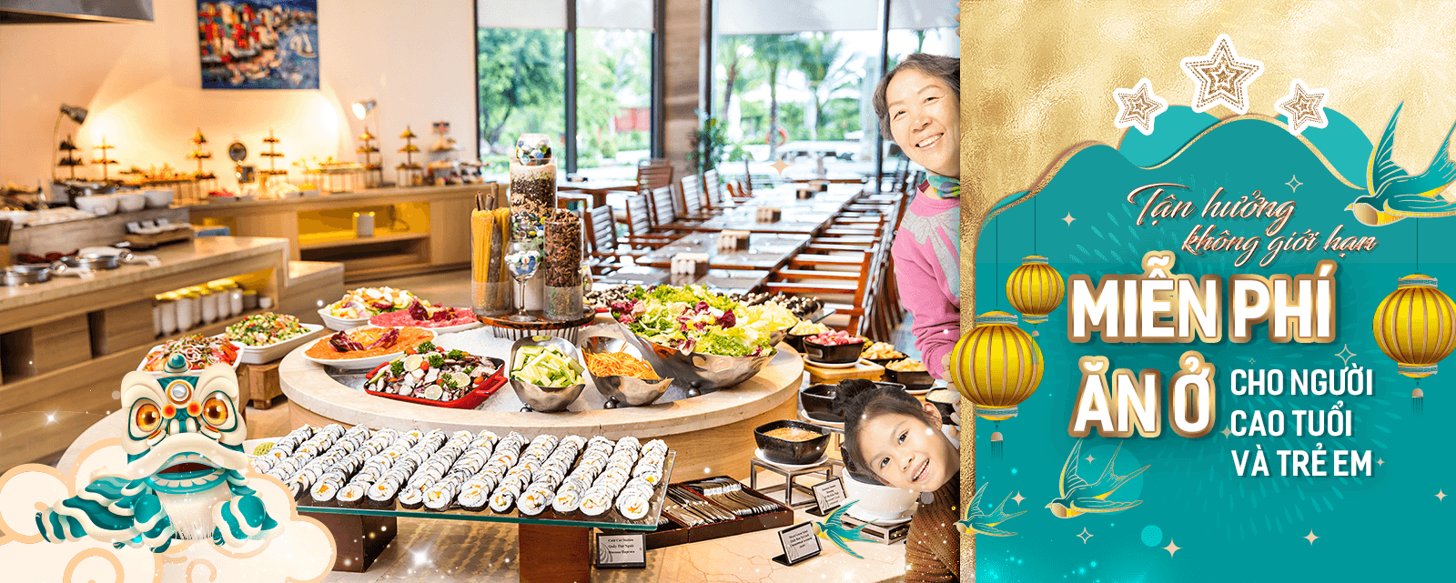 Miễn phí dịch vụ ăn ở cho 01 người cao tuổi trên 70 hoặc 02 trẻ em dưới 12 tuổi.